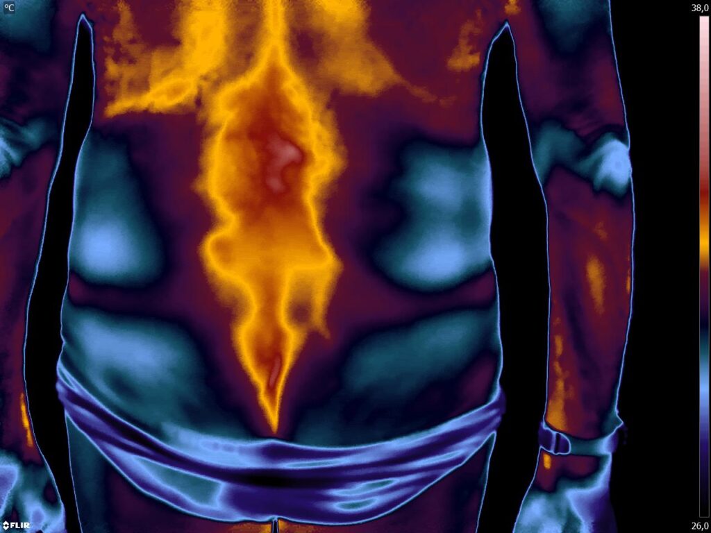 Como no caso do termograma abaixo de um paciente do sexo masculino, 80 anos, com comorbidades e que apresentou dor em região lombar. Foi realizado uma Análise Termofuncional e detectado alterações térmicas condizentes com o relato de dor.