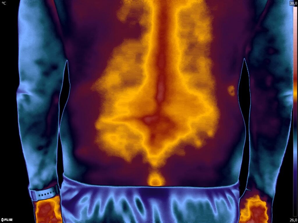 Como no caso do termograma abaixo de um paciente do sexo masculino, 55 anos, sem comorbidades e que apresentou dor lombar ao caminhar e não possuía nenhum exame de imagem prévio. Foi realizado uma Análise Termofuncional e detectado alterações térmicas condizentes com o relato de dor.